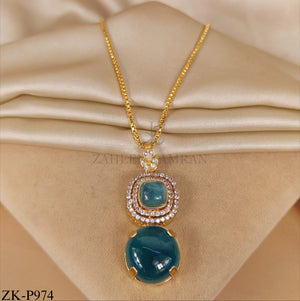 A luxurious gold pendant featuring a double pendant with a teal stone at its center, surrounded by zircons.