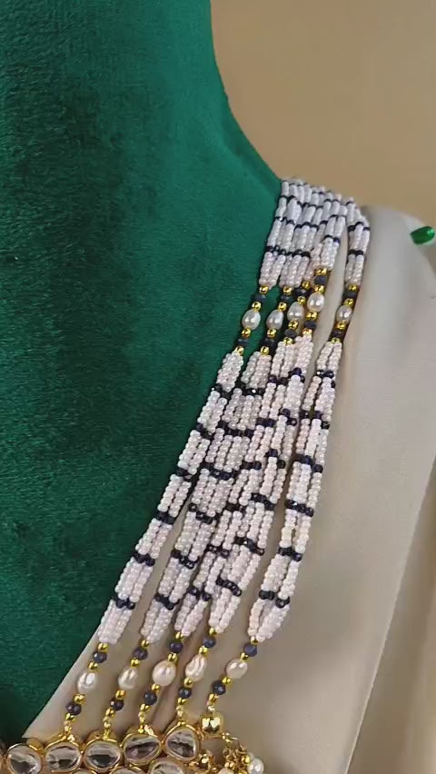 Handcrafted 22k gold plated mala adorned with kundan, black onyx, blue meena and pearls.