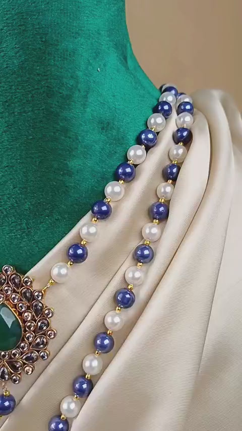 Handcrafted 22k gold plated mala adorned with smoky stones, sapphire and pearls.