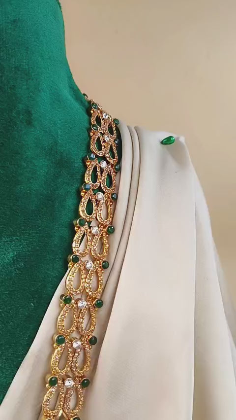 Handcrafted 22k gold plated mala adorned with emerald and Zircons.