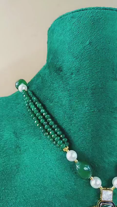 Handcrafted 22k gold plated mala adorned with emerald, Sheesh and amethyst.