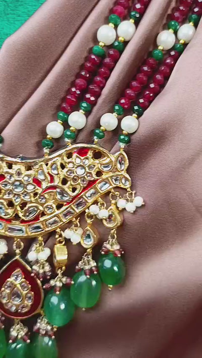 Handcrafted 22k gold plated mala studded with kundan, emerald and red Meena.