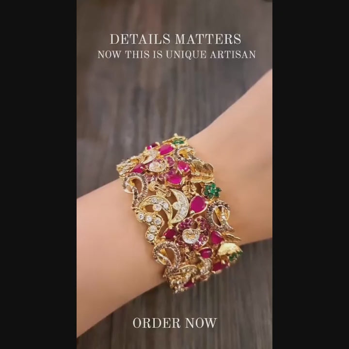 22 k gold plated bangle studded with zircons rubies emeralds and smoked stones