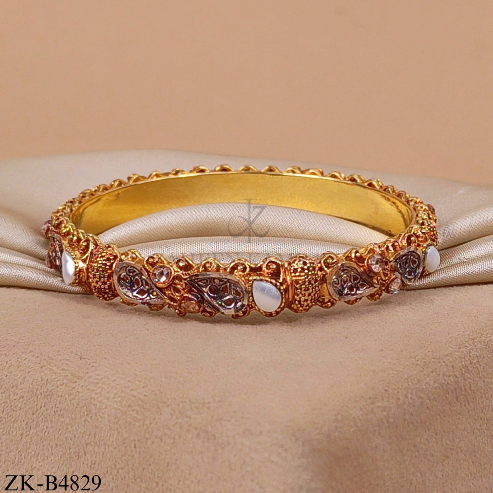 Golden antique-style bangle with intricate filigree design, adorned with crystal stones and pearls.