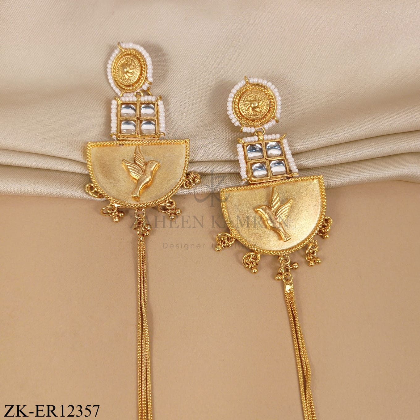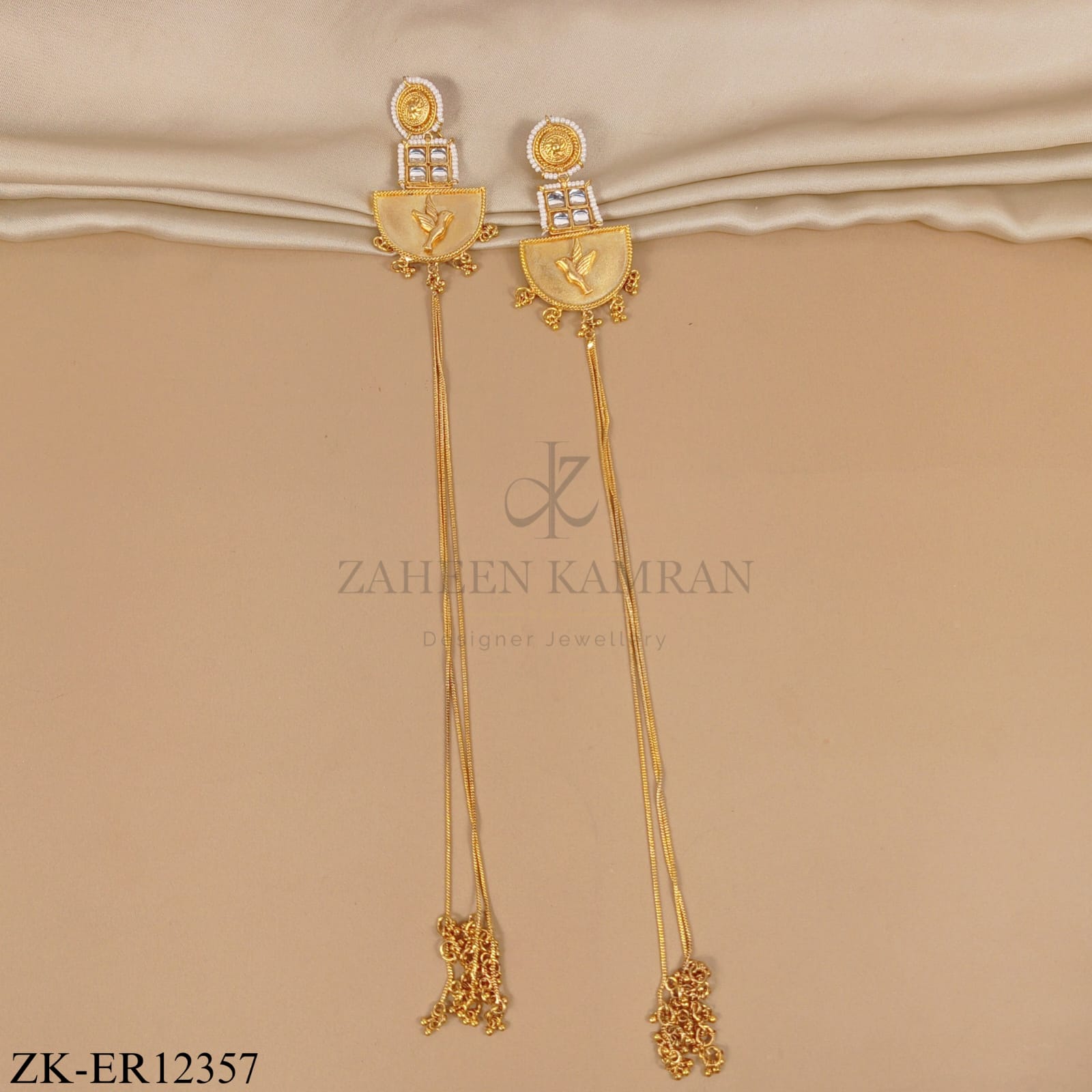 Gold earrings featuring a semi-circular gold pendant with a leaf design, long triple-chain tassel and a pearl-studded top.