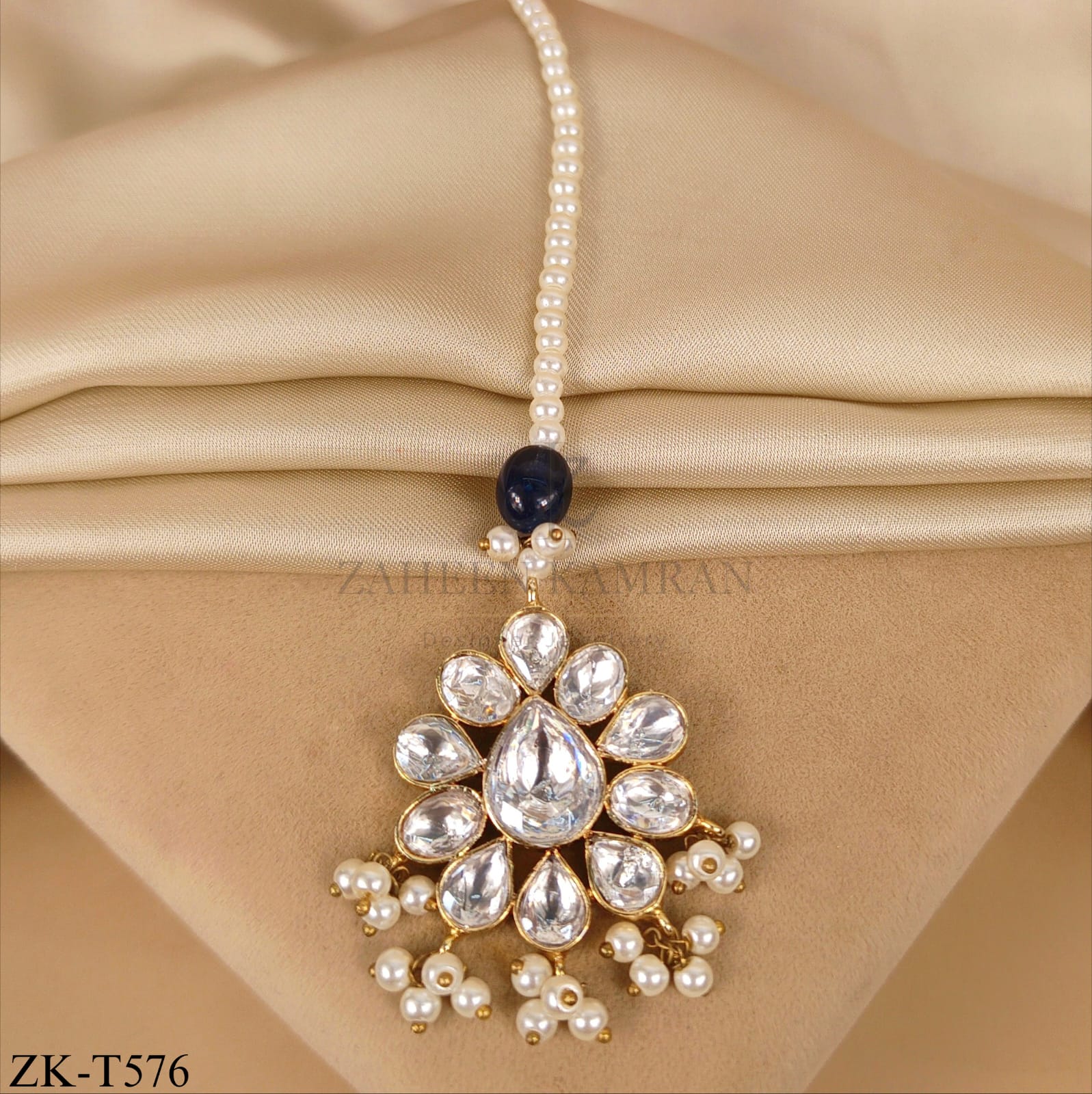 Elegant gold-toned tikka with kundan arranged in a flower motif, accented with pearls and a dark blue bead at the chain.