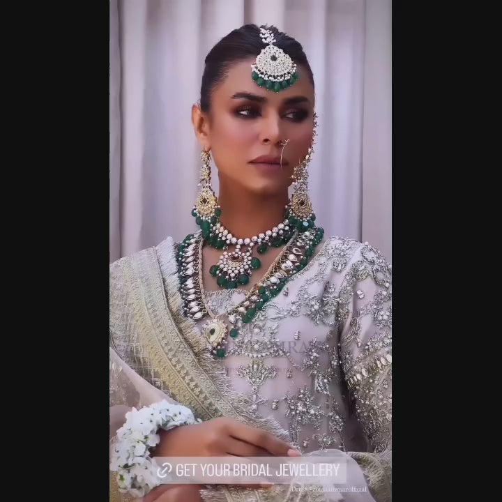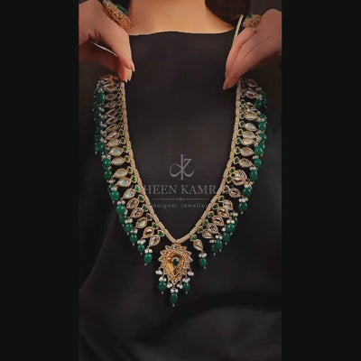 Handcrafted 22k gold plated long mala, necklace along with earrings, tikka and nath adorned with emeralds, kundan and pearls.