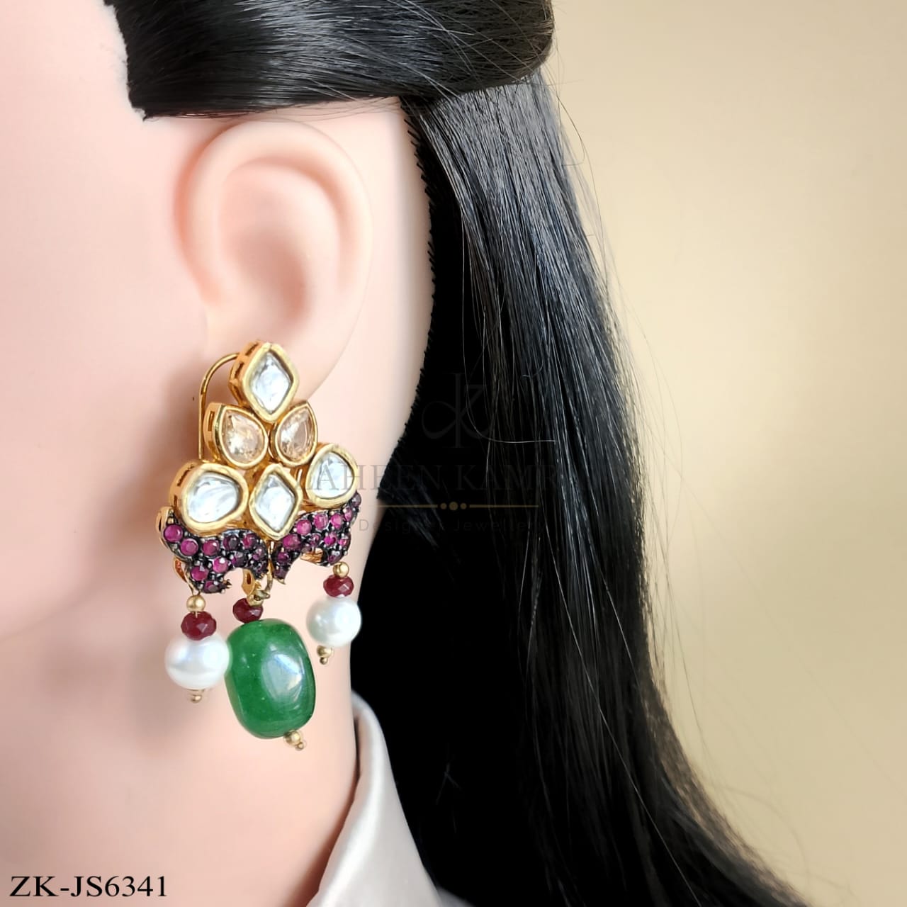 Handcrafted 22k gold plated choker, mala alongside earrings studded with emerald, kundan, pink zirconia and champagne.