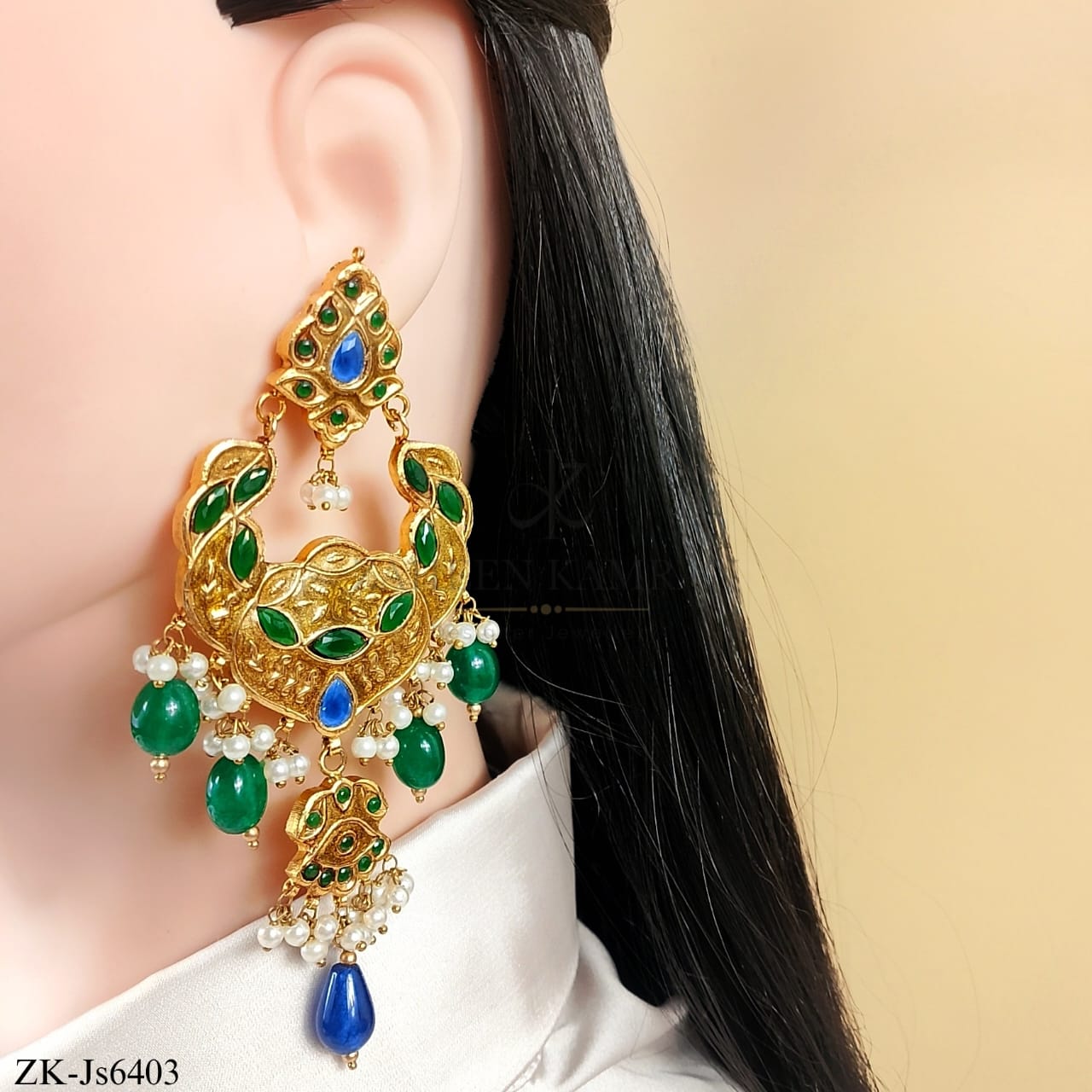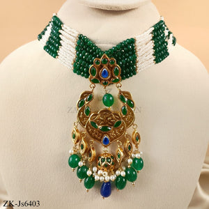 Handcrafted 22k gold plated choker alongside earrings studded with emerald, sapphire and pearls.