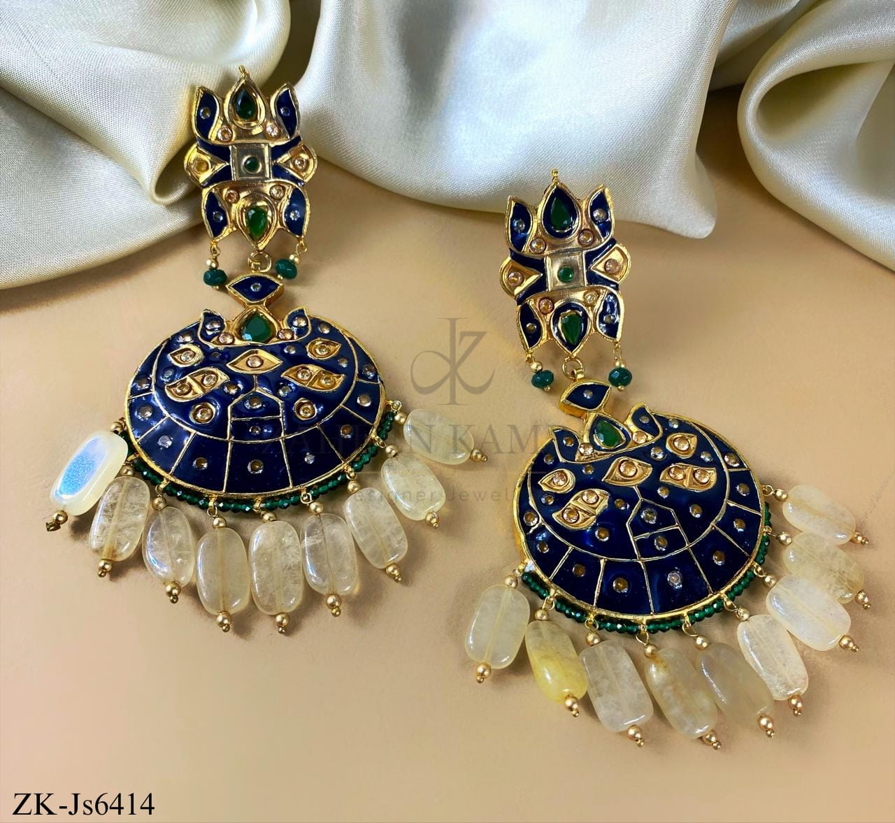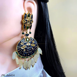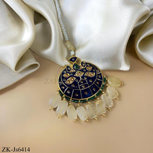 Handcrafted 22k gold plated choker alongside earrings and tikka studded with emerald and blue meena.