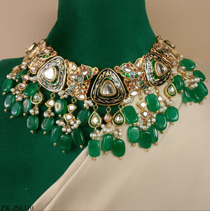 Handcrafted 22k gold plated necklace alongside earrings adorned with emerald, kundan, green meena and pearls.