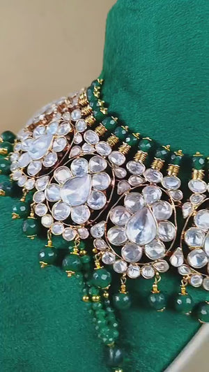 Handcrafted 22k gold plated mala, necklace alongside earrings and ring adorned with emerald and sheesh.