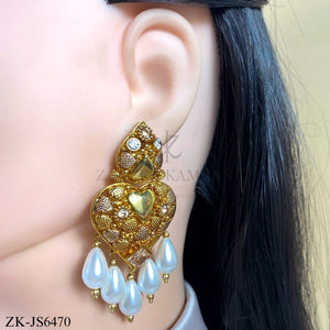 Handcrafted 22k gold plated necklace alongside earrings and tikka studded with champagne and pearls.