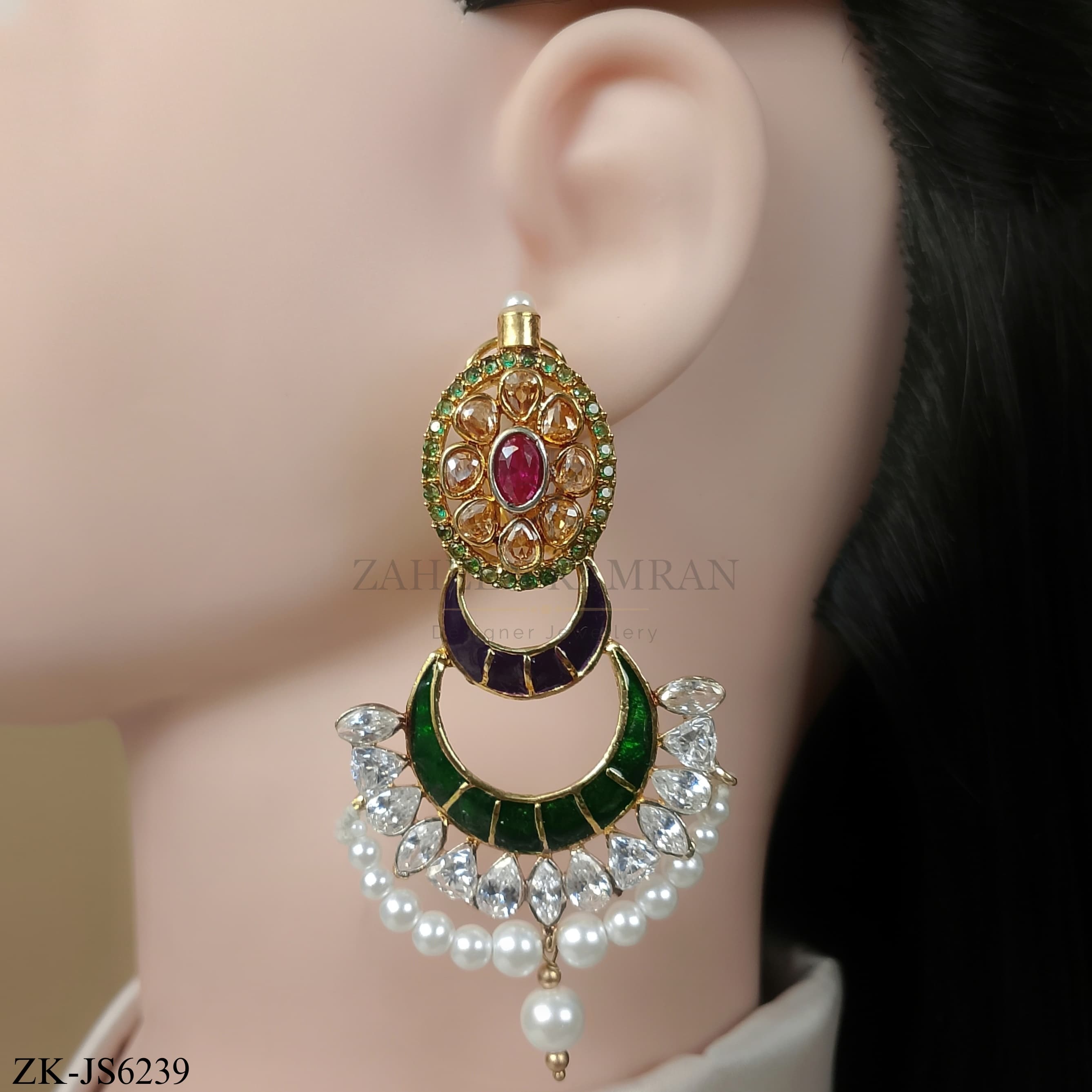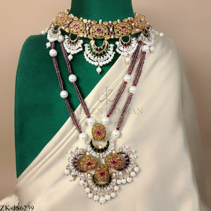 Handcrafted 22k gold plated necklace alongside mala and earrings adorned with ruby, champagne, Sheesh, pearls and green meena.