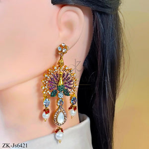 Handcrafted 22k gold plated mala alongside earrings studded with multi coloured stones.