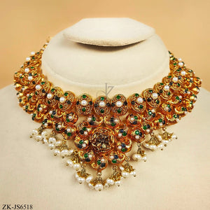 Handcrafted 22k gold plated necklace alongside earrings and tikka adorned with emerald, sapphire and pearls.