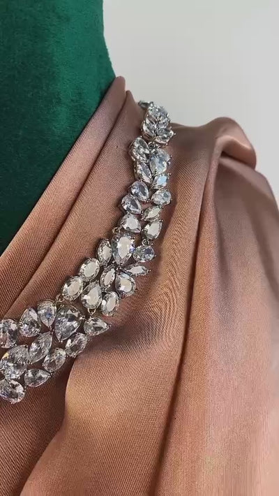 Handcrafted silver plated necklace alongside earrings adorned with Sheesh.