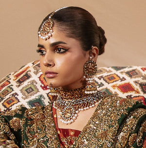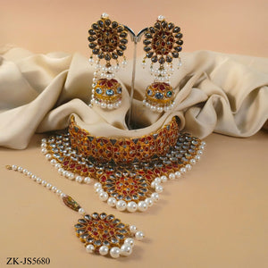 Handcrafted 22k gold plated necklace alongside earrings and tikka studded with smoky stones, ruby and pearls.