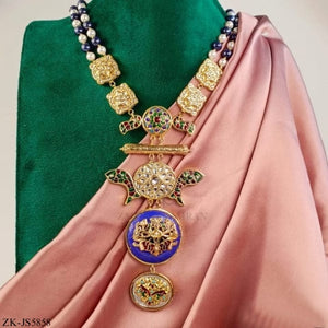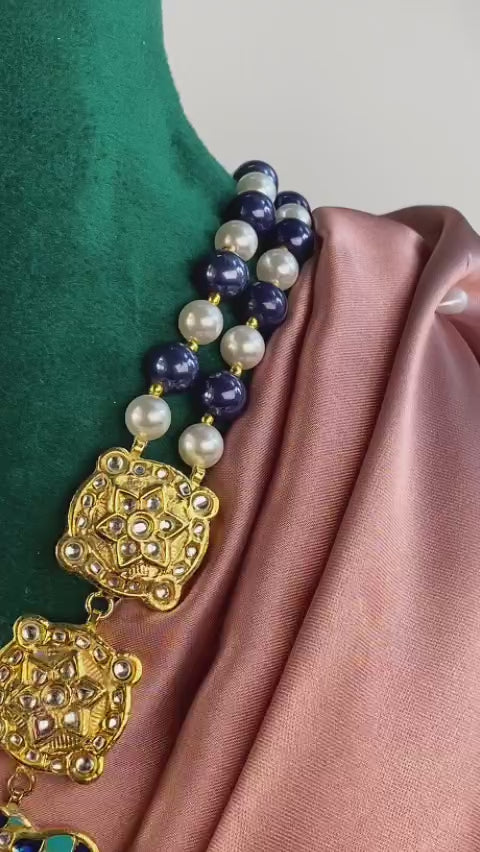 Handcrafted 22k gold plated mala alongside earrings adorned with kundan, blue and green meena.