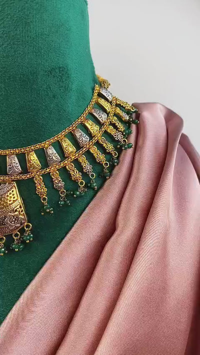 Handcrafted 22k gold plated necklace alongside earrings adorned with emerald.
