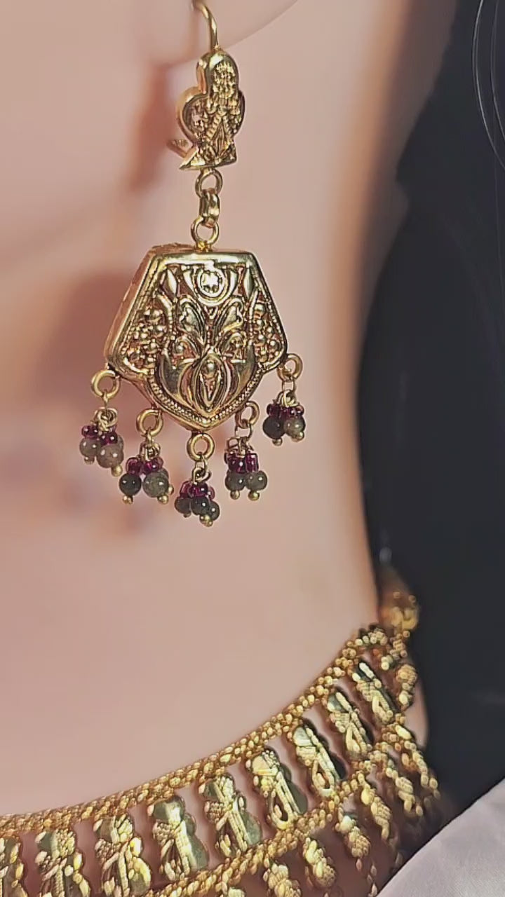 Handcrafted 22k gold plated necklace alongside earrings studded with emerald and ruby.