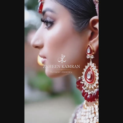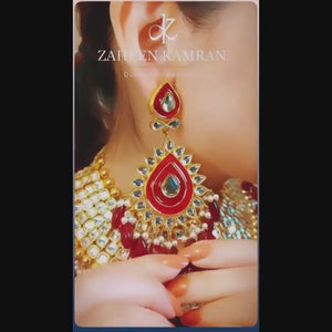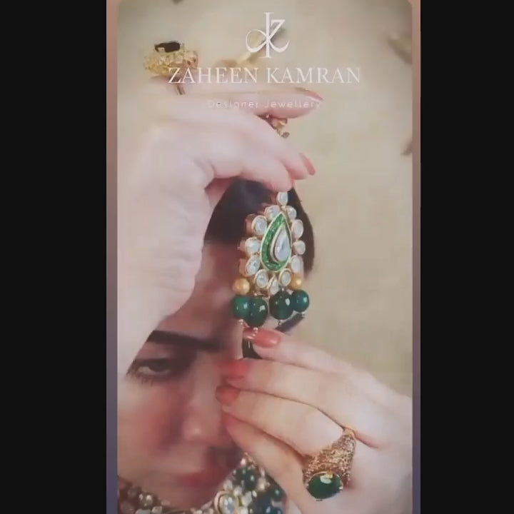 Handcrafted 22 k gold plated  kundan necklace with earrings tikka and jhumar studded with seesh stones,  handpainted with green meena. Pearls and emeralds hangings.