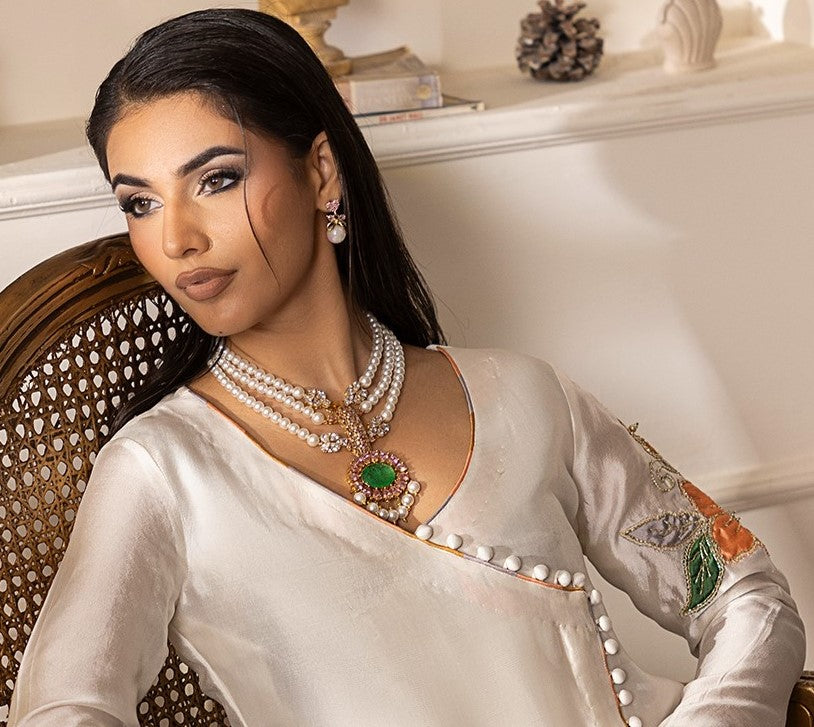 Handcrafted 22k gold plated mala alongside earrings adorned with pink stones, emerald and pearls.