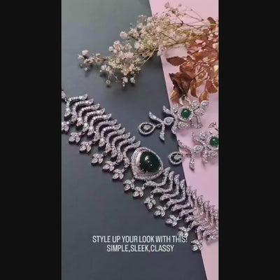 Handcrafted silver plated set with matching earrings studded with zircons and emerald.