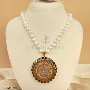 Handcrafted 22k gold plated calligraphy mala adorned with black onyx and pearls.