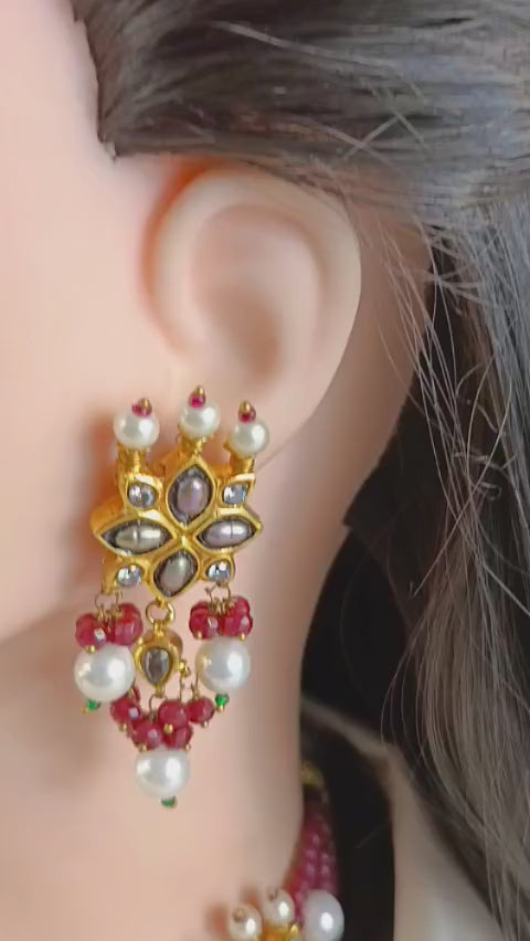 Handcrafted 22k gold plated necklace and earrings adorned with garnet, multi pearls.
