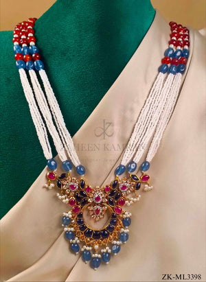 Handcrafted 22k gold plated mala studded with sapphire, ruby and pearls.