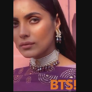 Handcrafted 22 k gold plated handwoven choker and earrings studded with zircons and champagne stones.