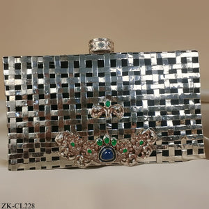 handcrafted silver plated clutch adorned with emerald and sapphire.