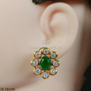 Handcrafted 22k gold plated earrings studded with emerald and zircons.