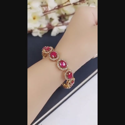 Handcrafted 22 k gold plated bracelet studded with ruby and zircon.