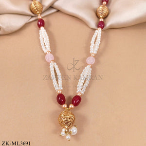 Elegant designer mala featuring white pearl strands with ruby and pink stone beads, gold-toned spherical pendants with pearl accents.