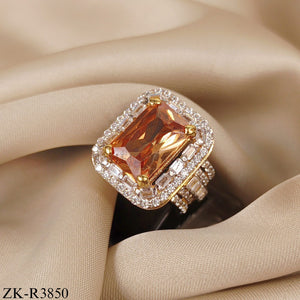A luxurious gold ring featuring a large champagne square-cut gemstone surrounded by a double halo of zircons.