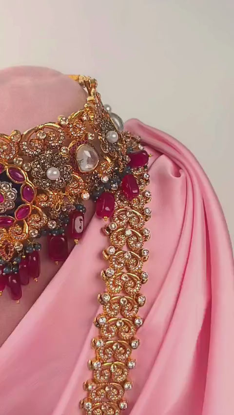 Handcrafted 22k gold plated necklace alongside earrings studded with ruby, zircons and Sheesh