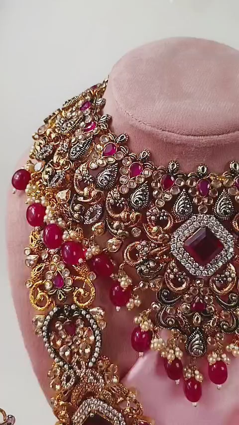 Handcrafted 22k gold plated necklace alongside earrings and matha Patti studded with ruby and zircons.