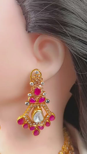 Handcrafted 22k gold plated necklace alongside earrings studded with ruby and sheesh.