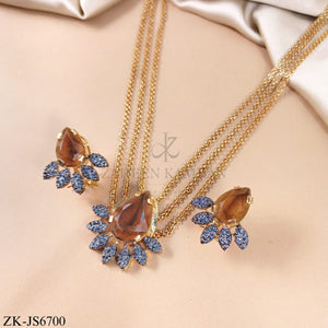 Elegant gold necklace and earring set featuring pear-shaped coffee gemstone pendants surrounded by smoky stones leaf motifs.