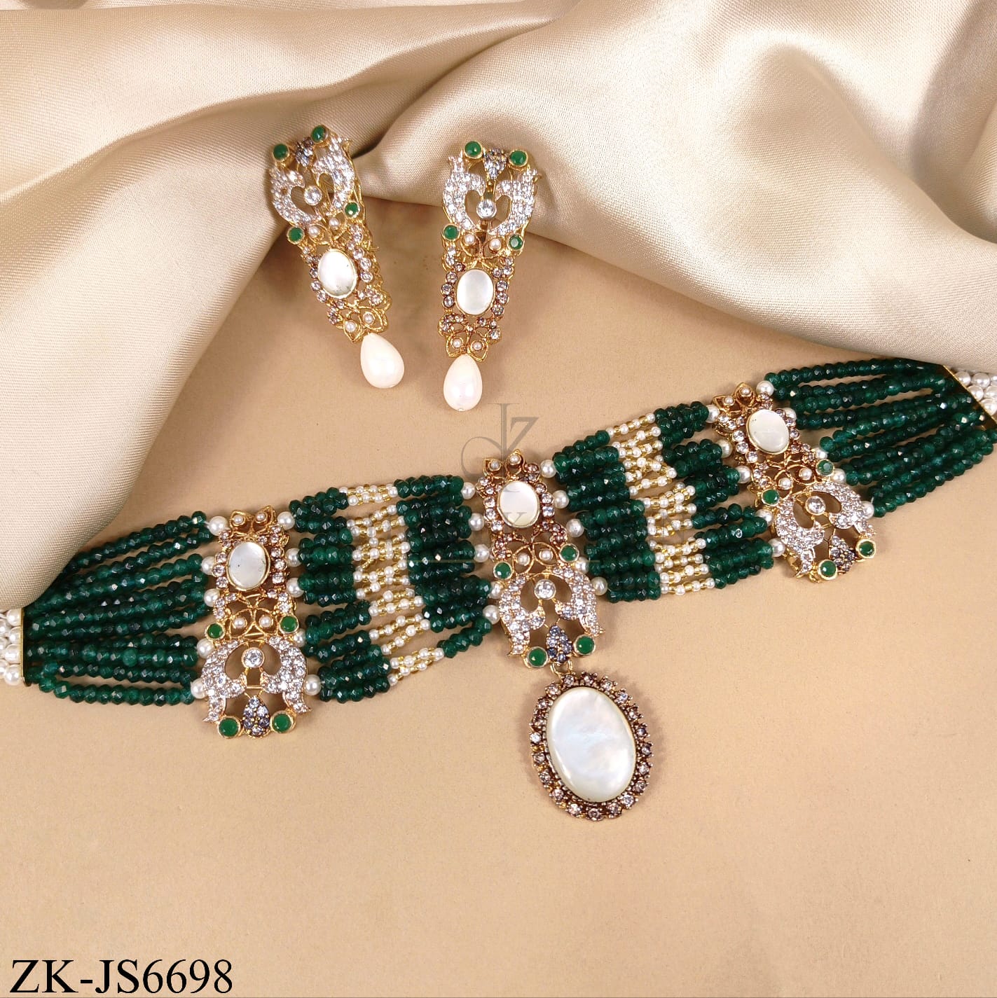 Elegant gold-toned choker and earring set adorned with emerald, pearls, and diamond-like stones featuring central white gem pendants.