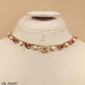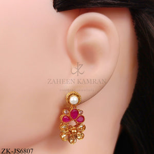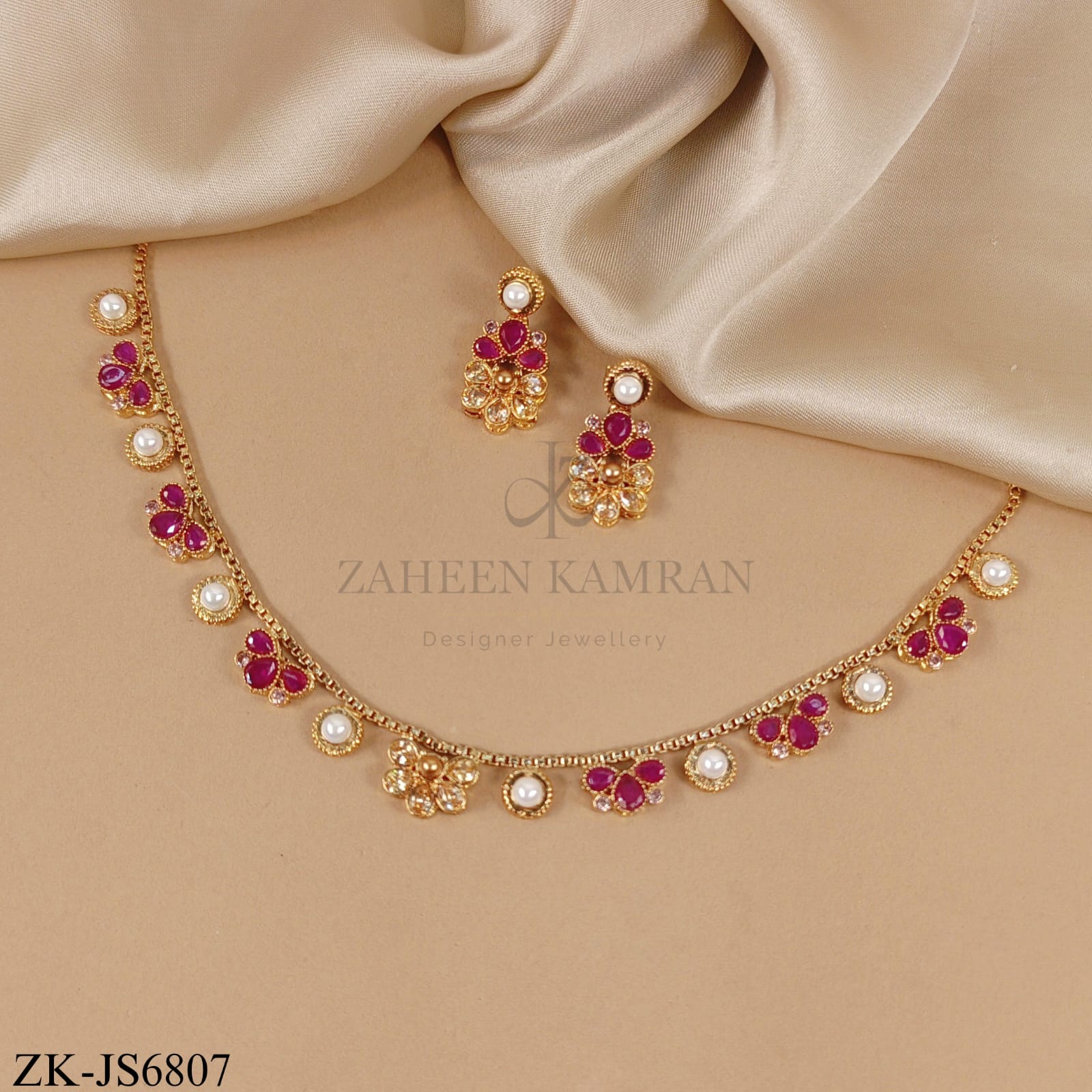 Gold necklace and earring set adorned with pink zirconia, pearls, and clear zirconia gems in a floral design.