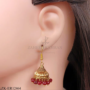 Product Overview: These are elegant gold hook earrings with red beads. The gold bell shape shines beautifully on ears. The design mixes gold texture with red stones nicely. The earrings add classic charm to any outfit. They suit weddings, parties, and daily wear beautifully. The craftsmanship makes the piece feel very luxurious. Customers will love wearing these shining gold earrings.