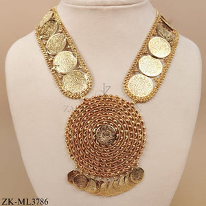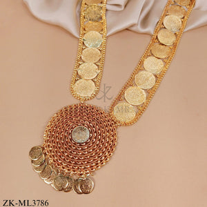 - Product Overview: An exquisite gold tone mala featuring a majestic circular pendant framed by concentric rope‑twisted chains and cascading coin charms. The elegant design blends regal coin motifs with intricate chainwork, creating a statement piece that exudes timeless luxury and cultural sophistication, perfect for elevating any formal ensemble.