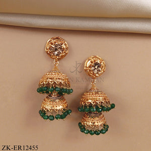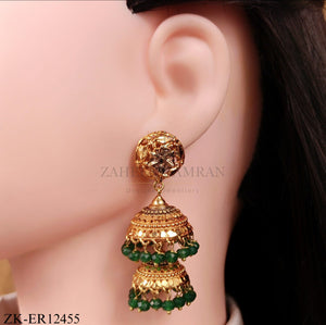 Product Overview: These elegant gold earrings have two hanging bells. The top circle holds a clear stone beautifully. The gold finish shines with green bead accents. The design looks classic and very attractive. The earrings add luxury to any outfit easily. The craftsmanship makes the piece feel very special. You will love wearing these stunning gold earrings.