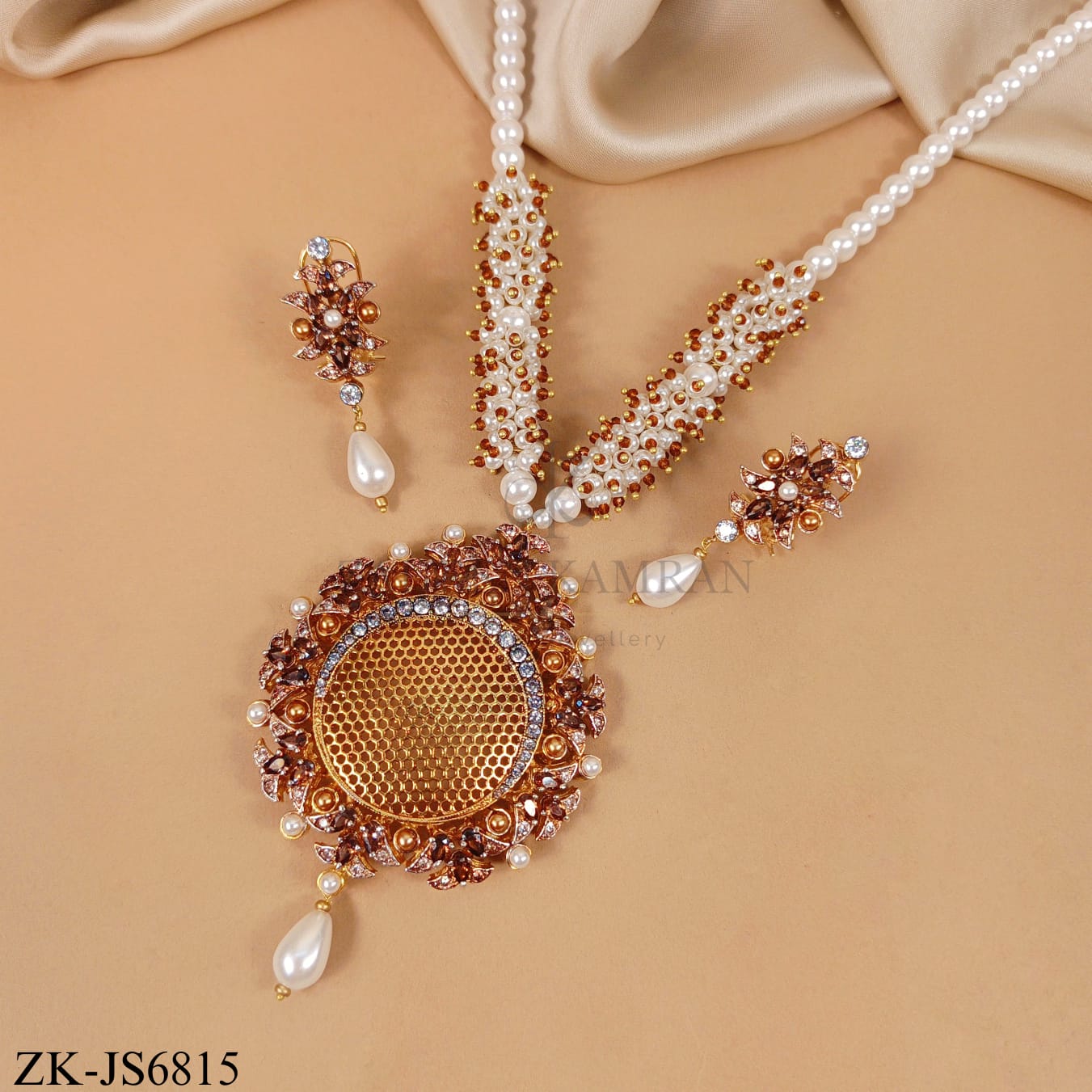 [8:36 PM, 3/7/2026] Aqsa Kafeel: Product Overview: This gold necklace set looks very elegant and beautiful. The large round pendant shines with pearls and stones. The matching earrings complete the luxurious look perfectly.