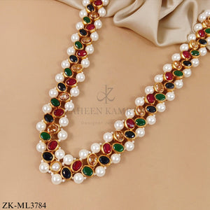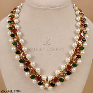 A luxurious gold-toned pearl necklace adorned with multicolored oval gemstones set in gold bezels.