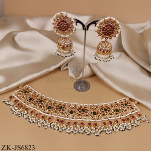 Product Overview: This gold necklace and earrings set looks elegant. The design mixes red, green, and white stones beautifully. The set adds luxury to any special outfit. The gold finish shines brightly on skin. The necklace has a wide curved shape. The earrings have round tops with hanging bells. The set feels perfect for festive celebrations.
