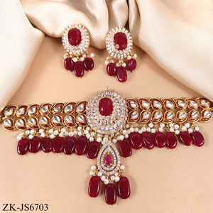 Elegant gold-toned choker set with ruby, red enamel, kundan and pearl detailing features a matching pair of earrings.